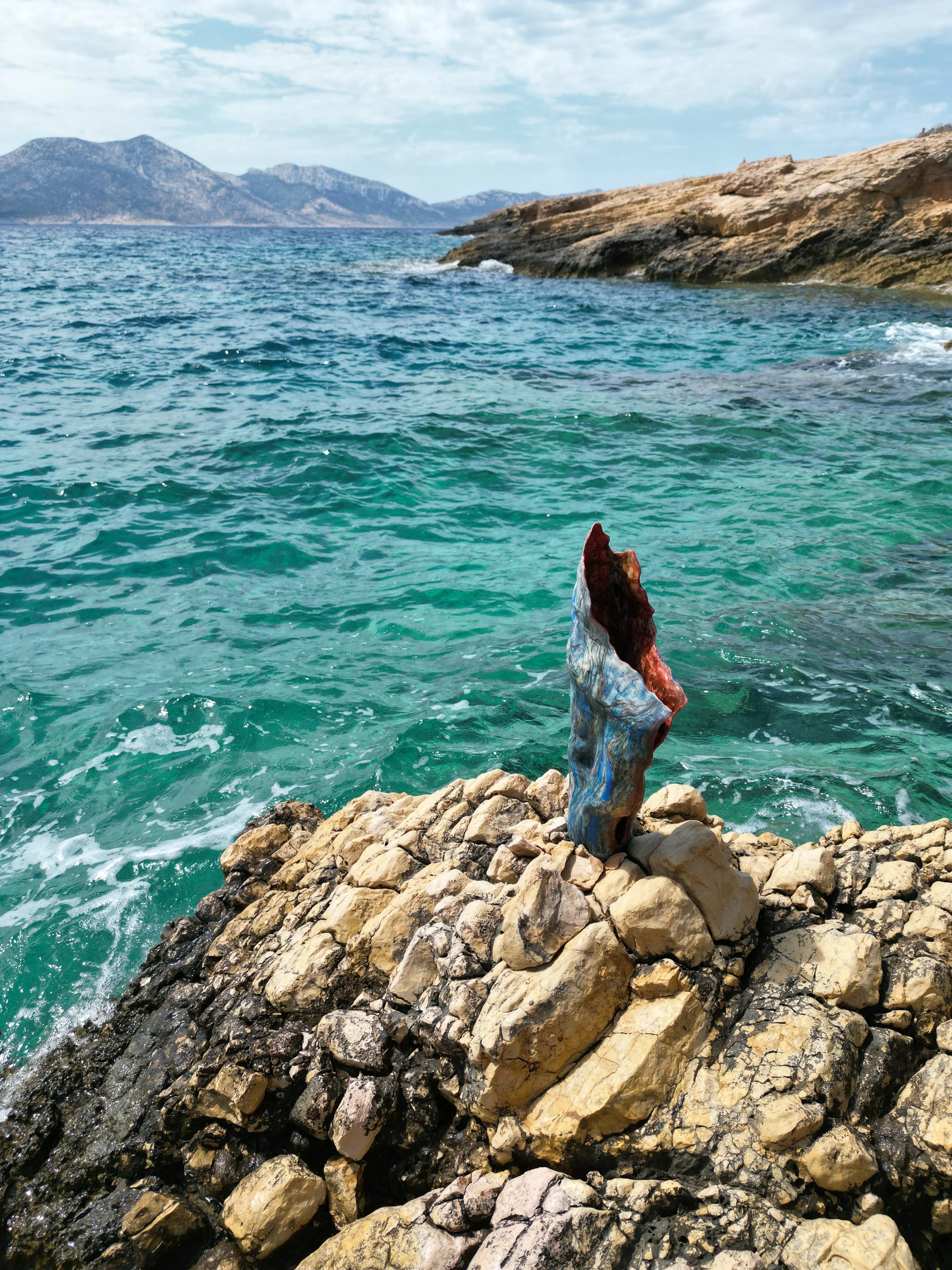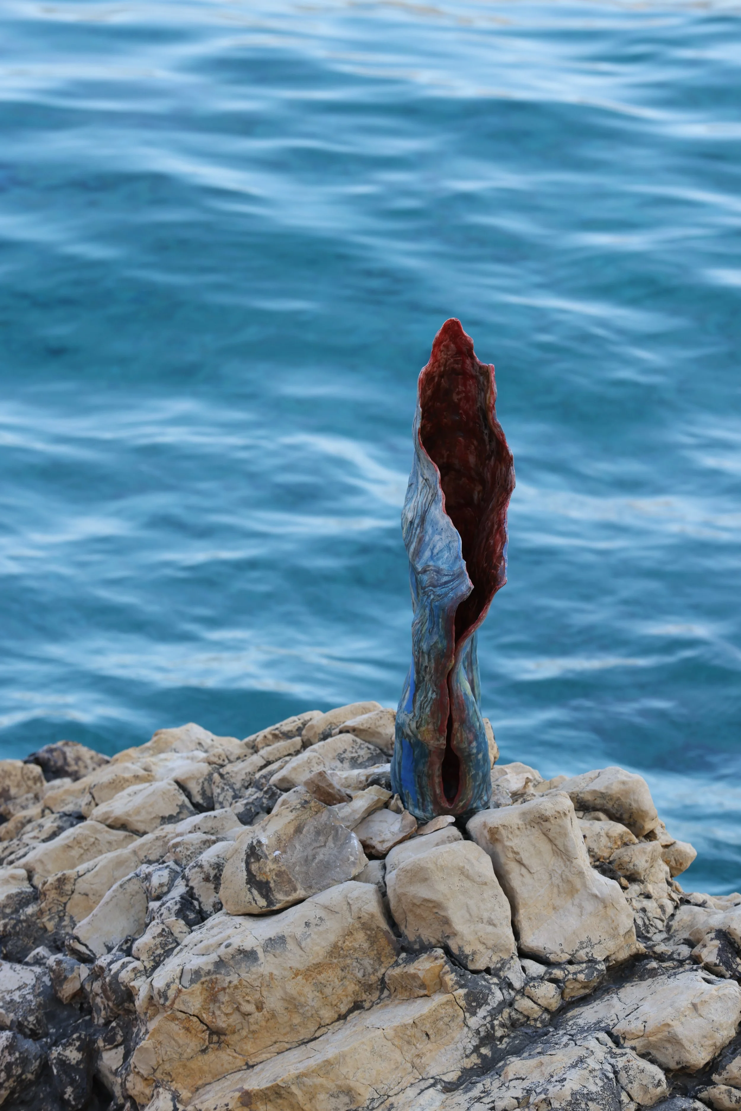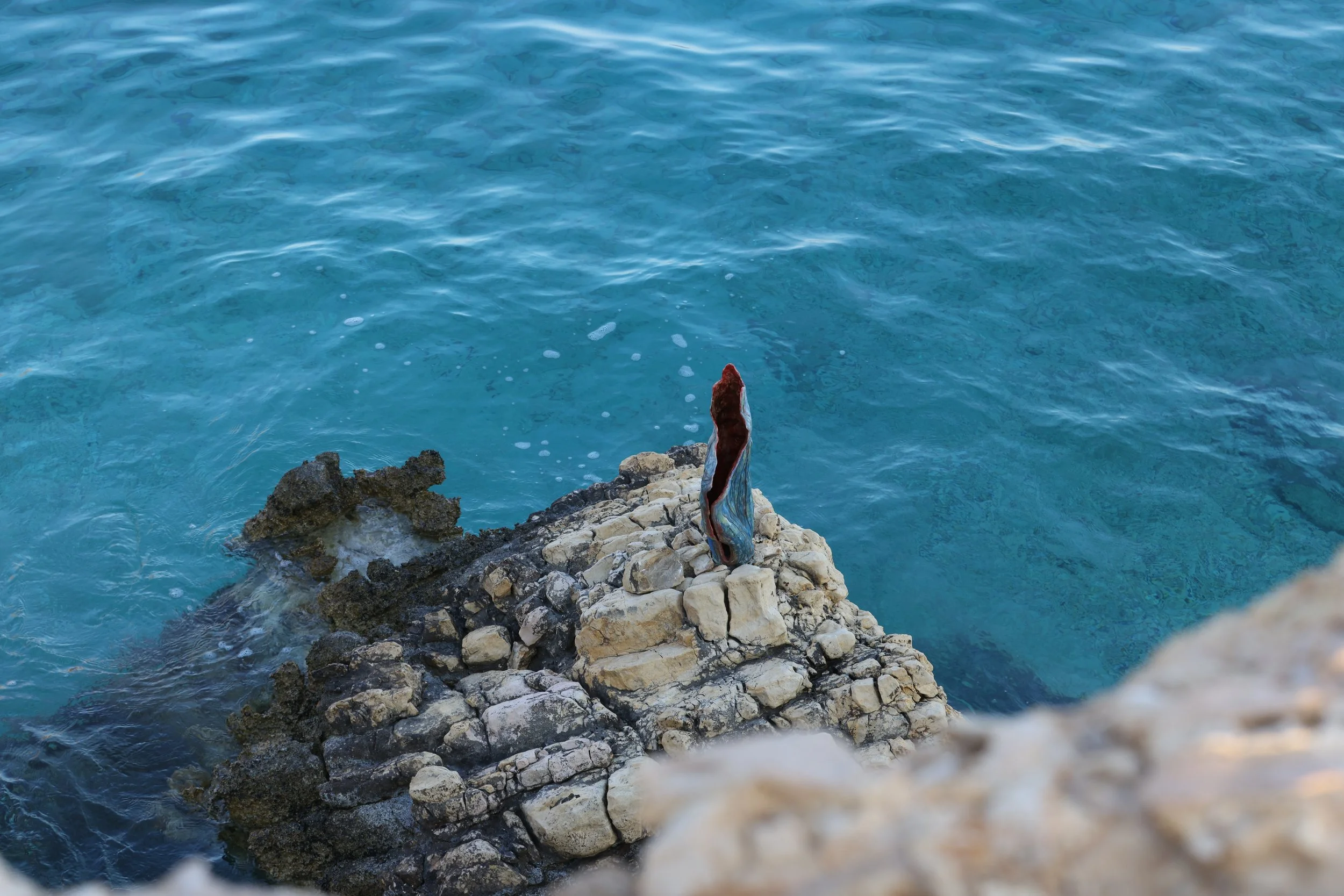 Using these observations as a starting point, I introduced painterly gestures onto the ceramic surface, blending external and internal landscapes. Ripple found its place nestled among the island’s rock formations and the ever-shifting sea. Installed there intentionally, it is meant to weather, fragment, and transform over time—succumbing to the same elemental forces that inspired its creation.